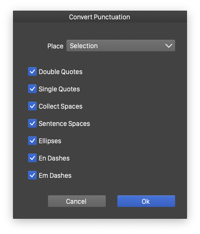 - Convert Punctuation - Convert the various punctuation styles in the selected text, selected flow, or the whole document. Converting punctuations can be used to detect and replace quotes, spaces and dashes to typographically suitable characters.