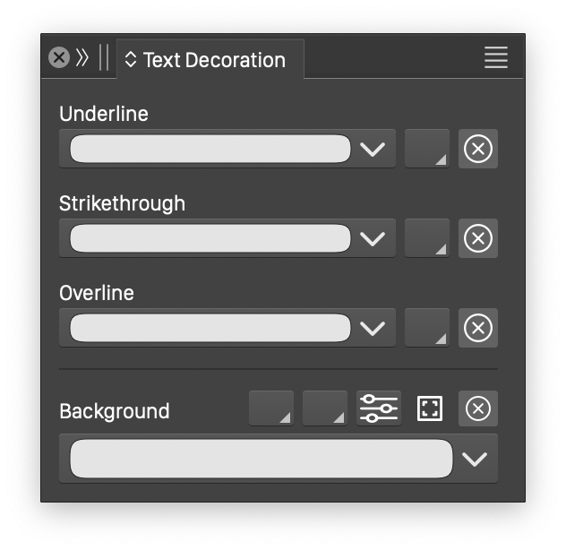 The Text Decoration panel can be used to select underline, strikethrough, overline and background styles, of the highlighted text. These options are also available in the Character Options command. The Text Decoration panel can be opened from the Window - Text menu.