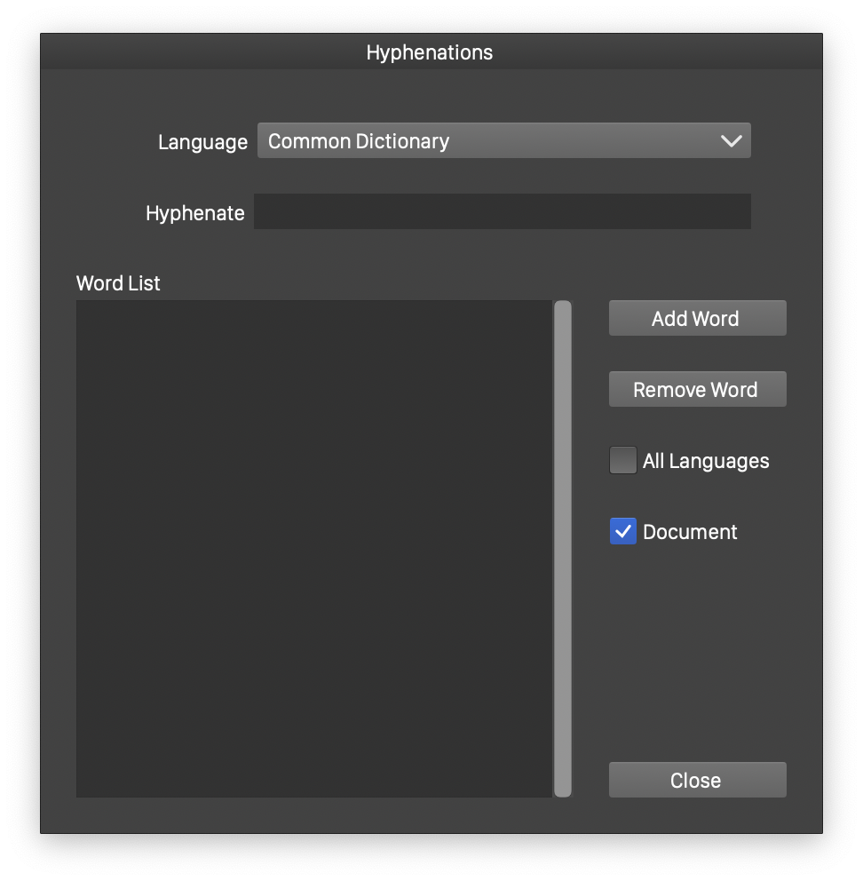 - Press Close to complete the hyphenation dictionary editing.