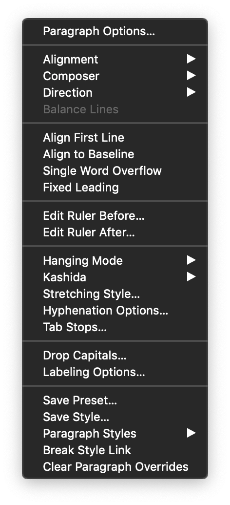 The Paragraph panel menu
