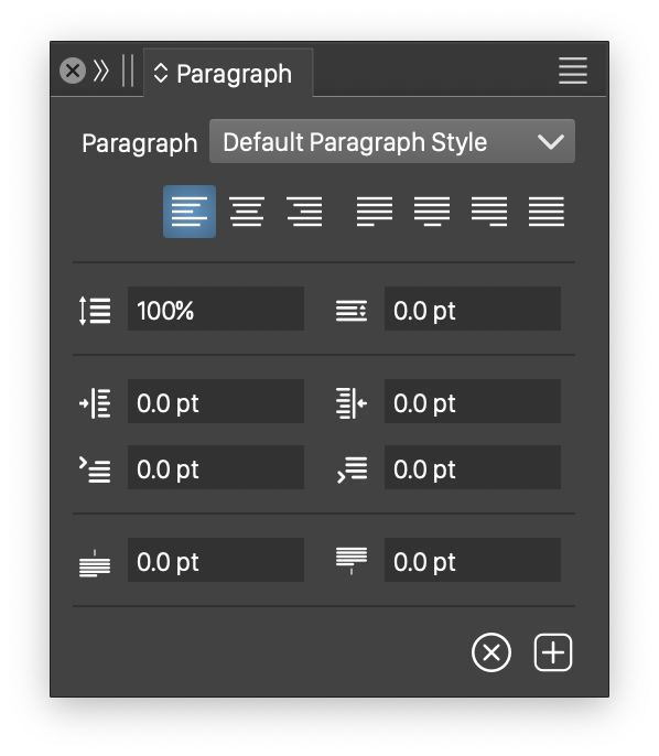 The following paragraph options can be selected from the Paragraph panel: