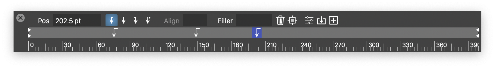 - Pos - Edit the position of the selected tab stop.