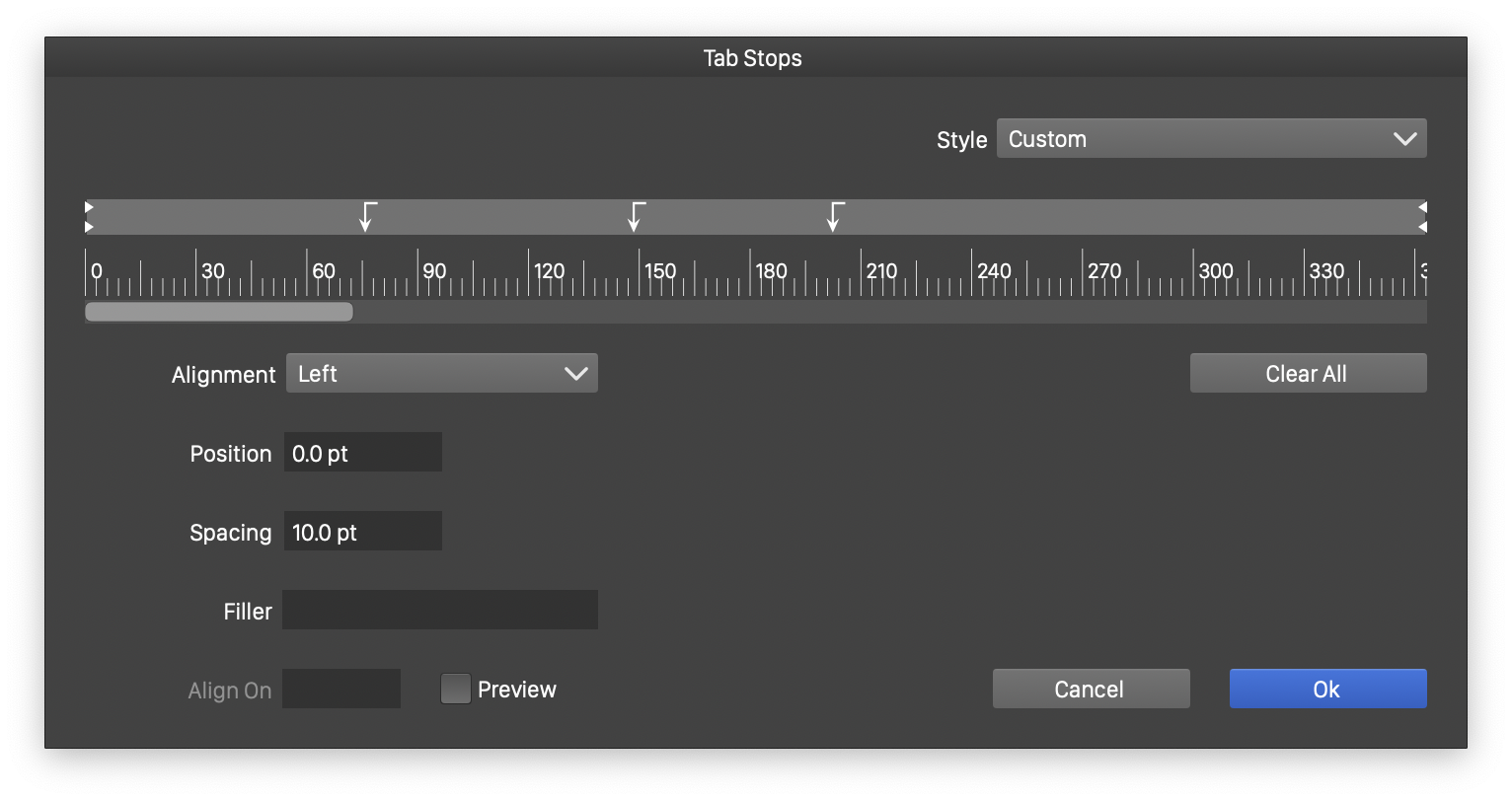 - Position - Edit the position of the selected tab stop.