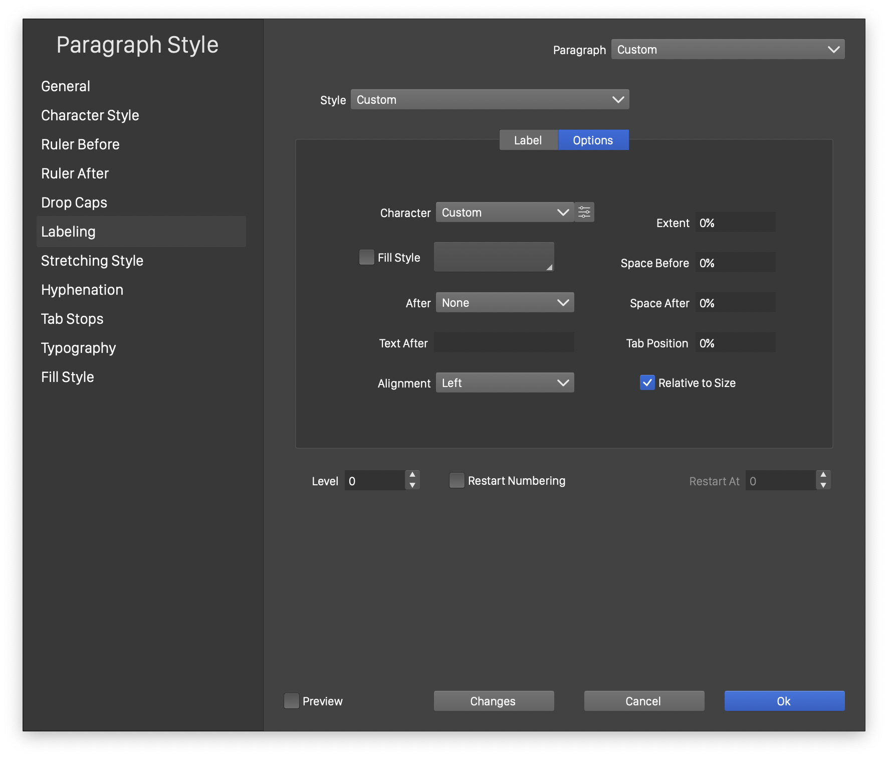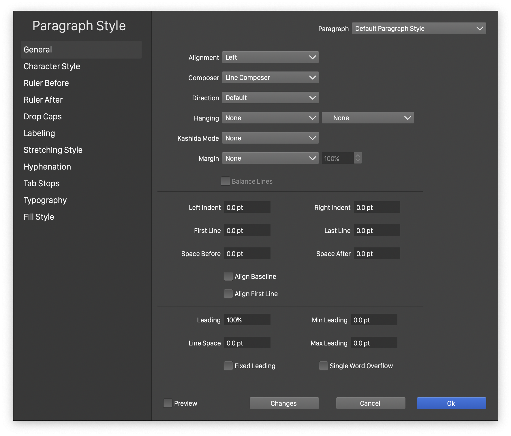- Changes - Open a menu of paragraph formatting option names, to enable or disable the selection of specific options. When applying paragraph options (or creating paragraph styles), it is possible to change only a subset of options, leaving the other formatting options as they were on the selected text. By default, the option changing is automatically enabled, when the corresponding value is changed in one of the sections of the view. Options can be individually enabled or disabled, by checking or unchecking in the menu opened with the Changes button.