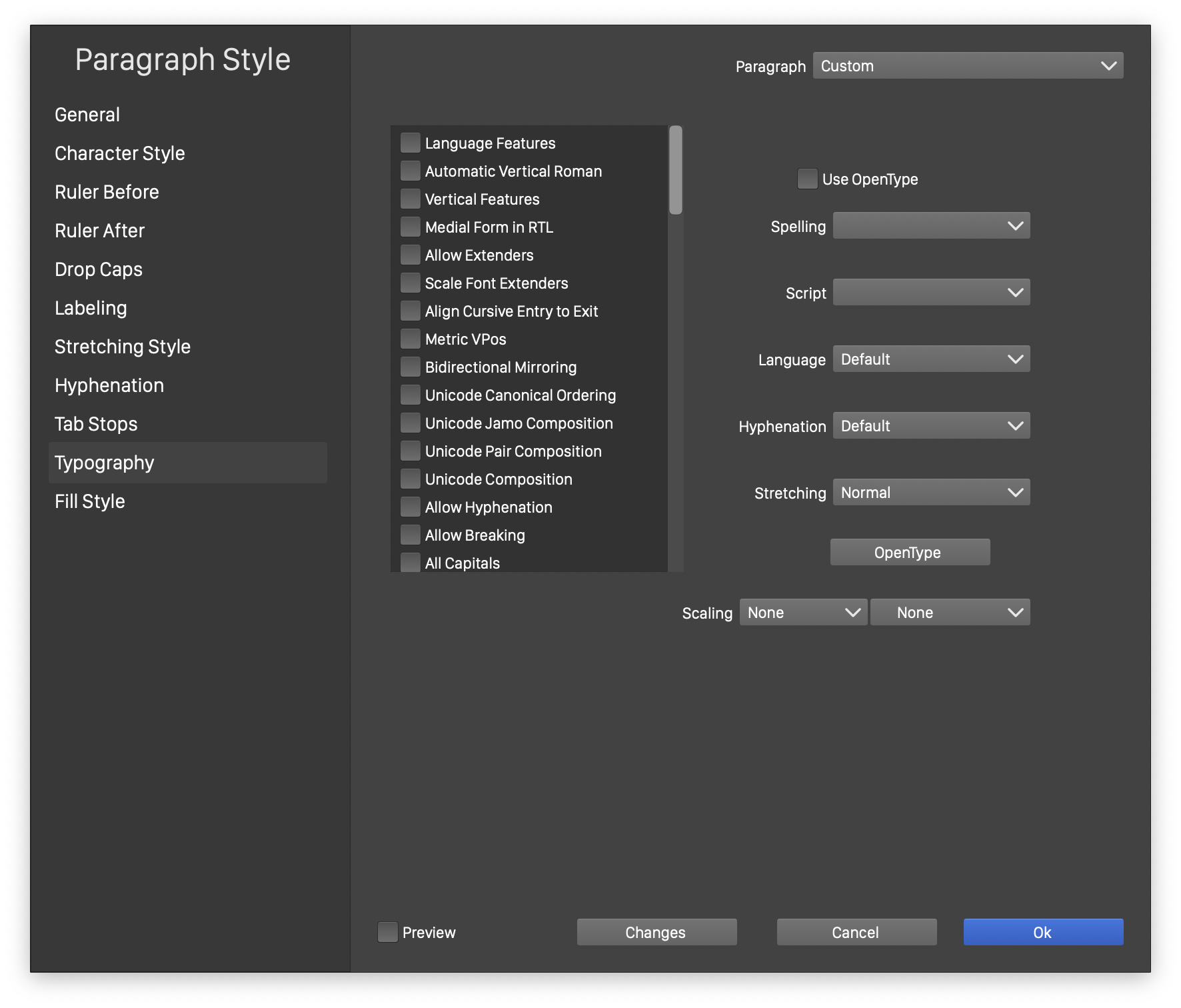 - The list of check boxes is used to enable or disable various options in the character style. Most of these options are used to select OpenType features.