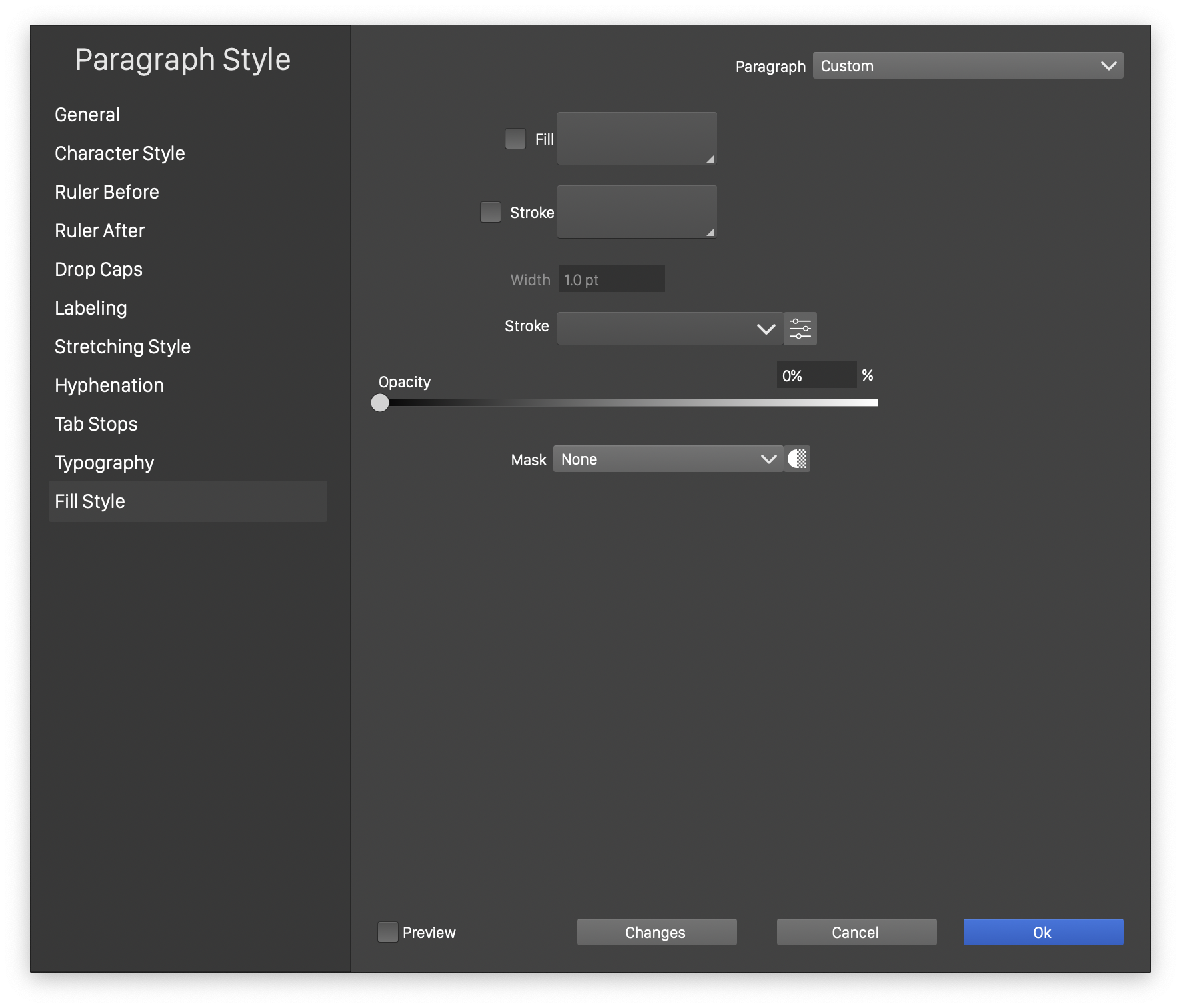 The Fill Style section of the Paragraph Style view.