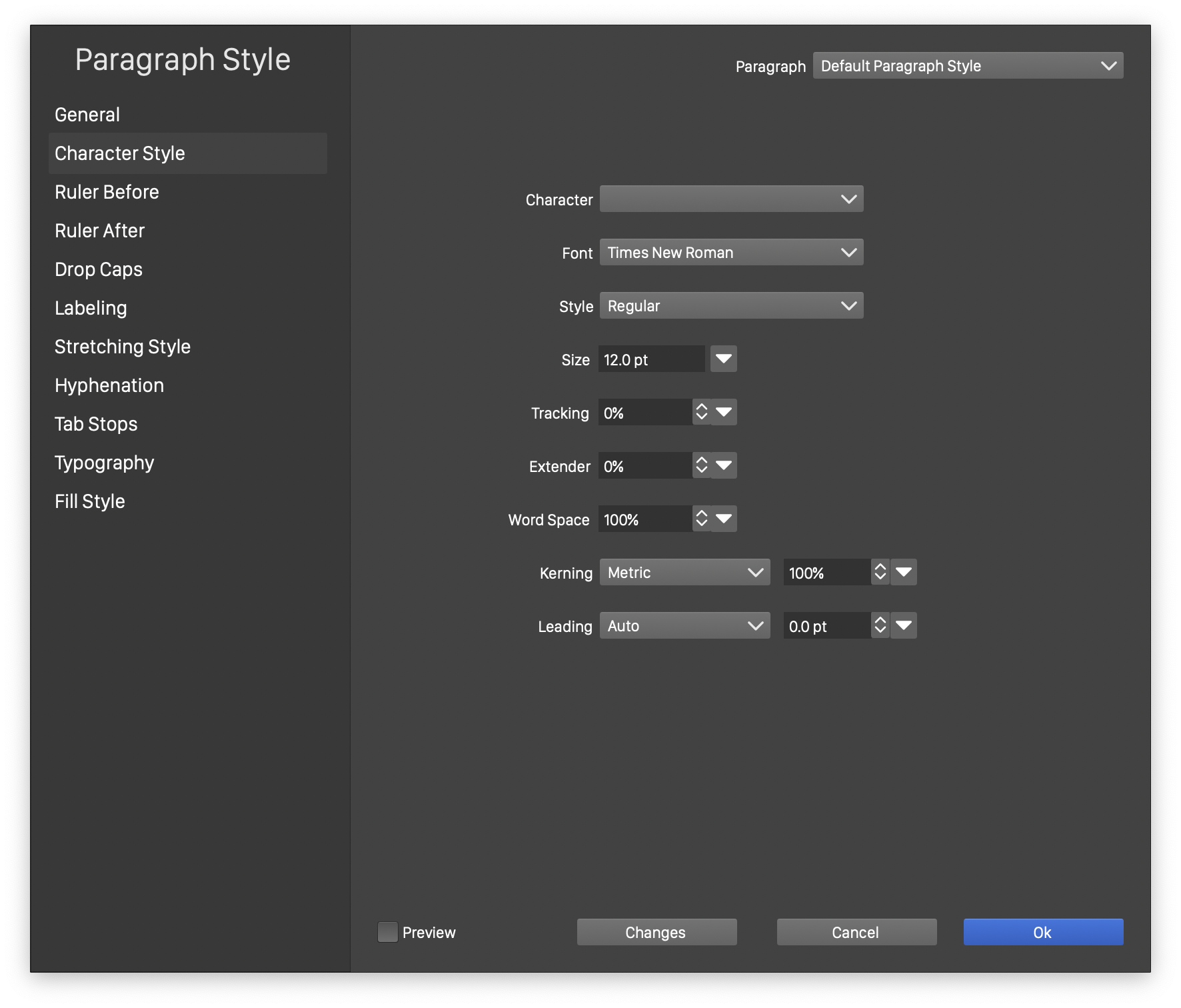 The Character Style section edits the default character style used in the paragraph text. The options selected here are also described in the Character Options section.