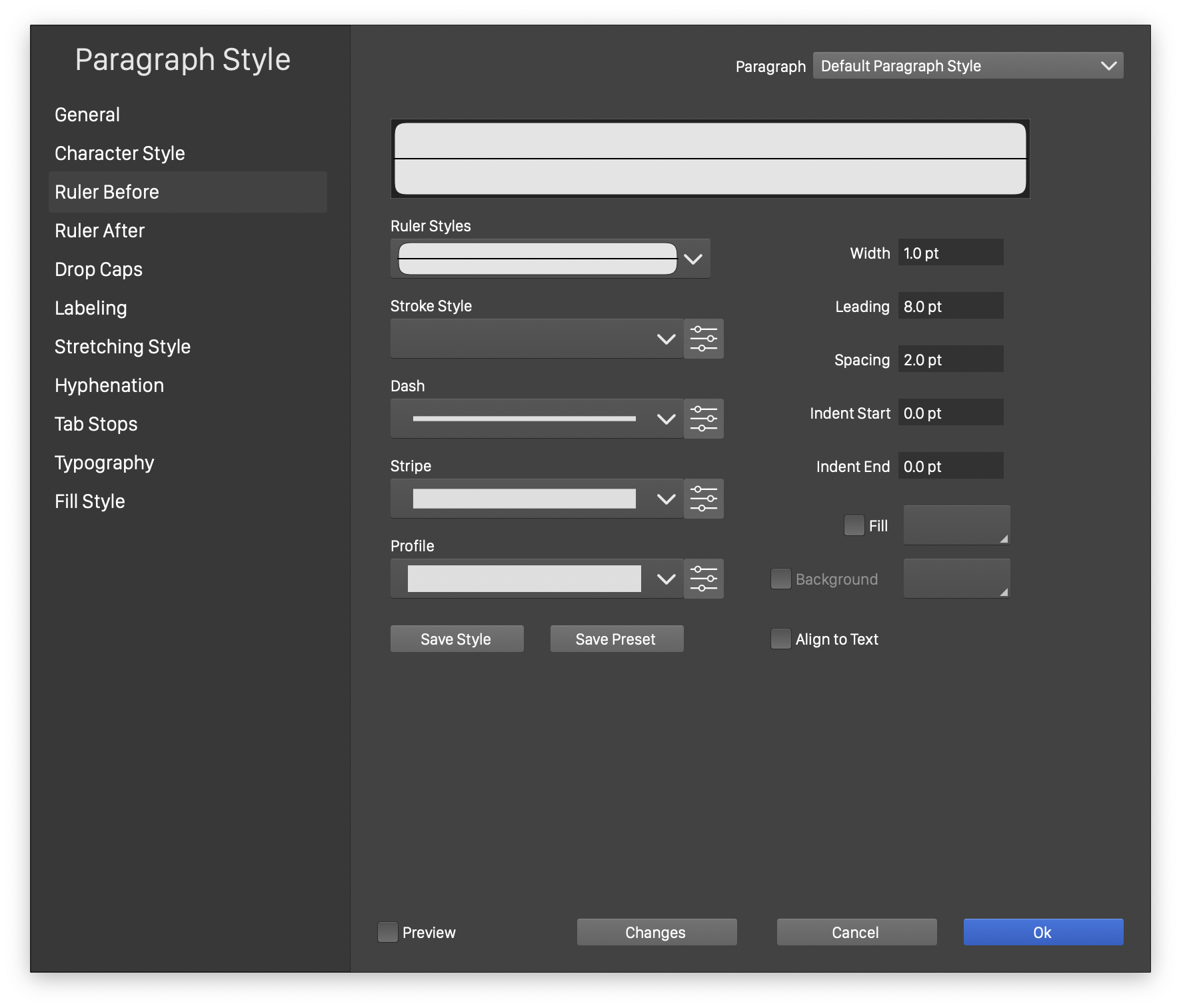 button next to the stroke style drop box is used to edit all the stroke options used in the paragraph ruler line. - Dash - Open a list of dash styles and presets, that can be used to create paragraph rulers. The
