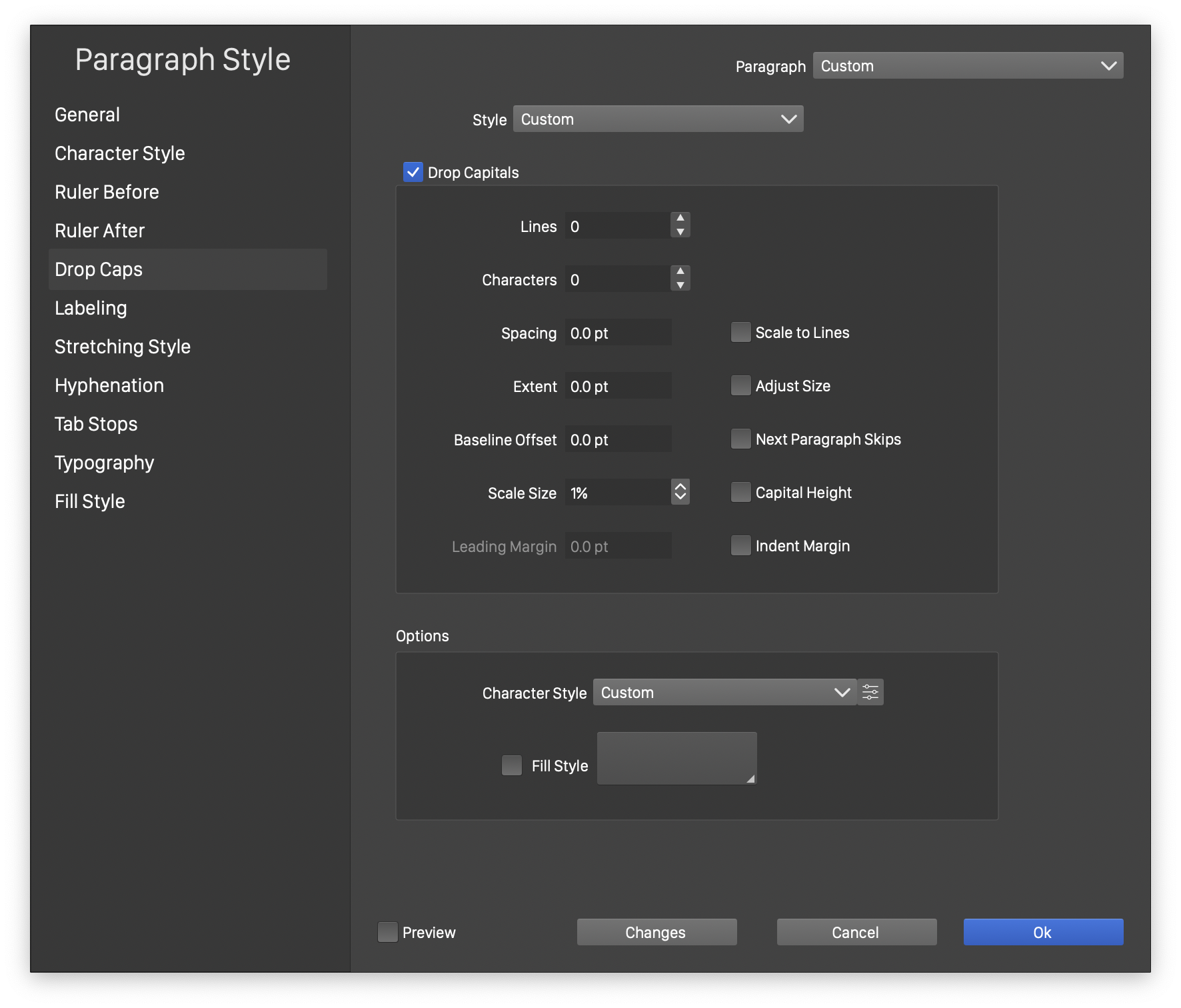 The Drop Capitals section of the Paragraph Style view.