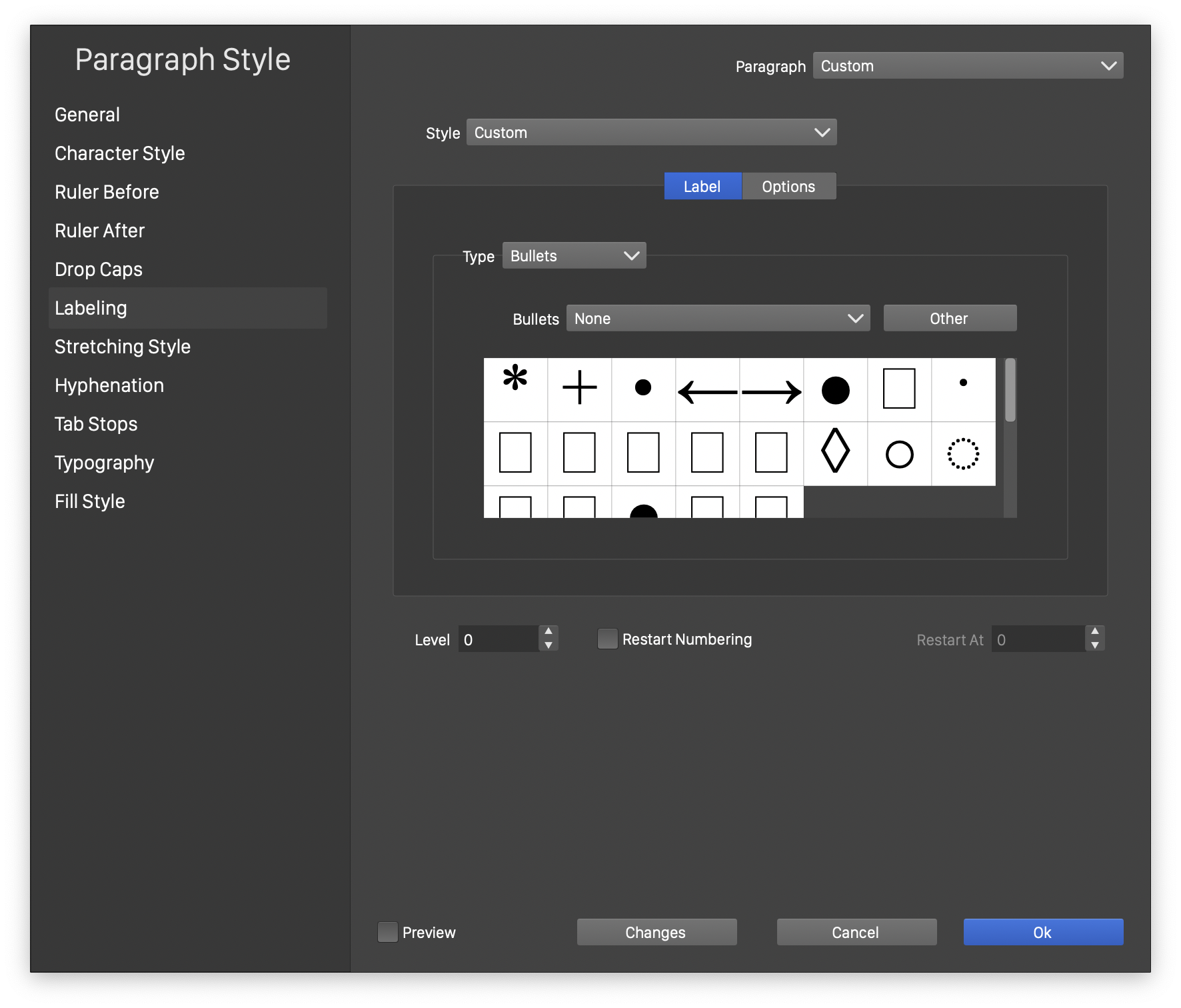 Setting up bullets in the Paragraph Style view.