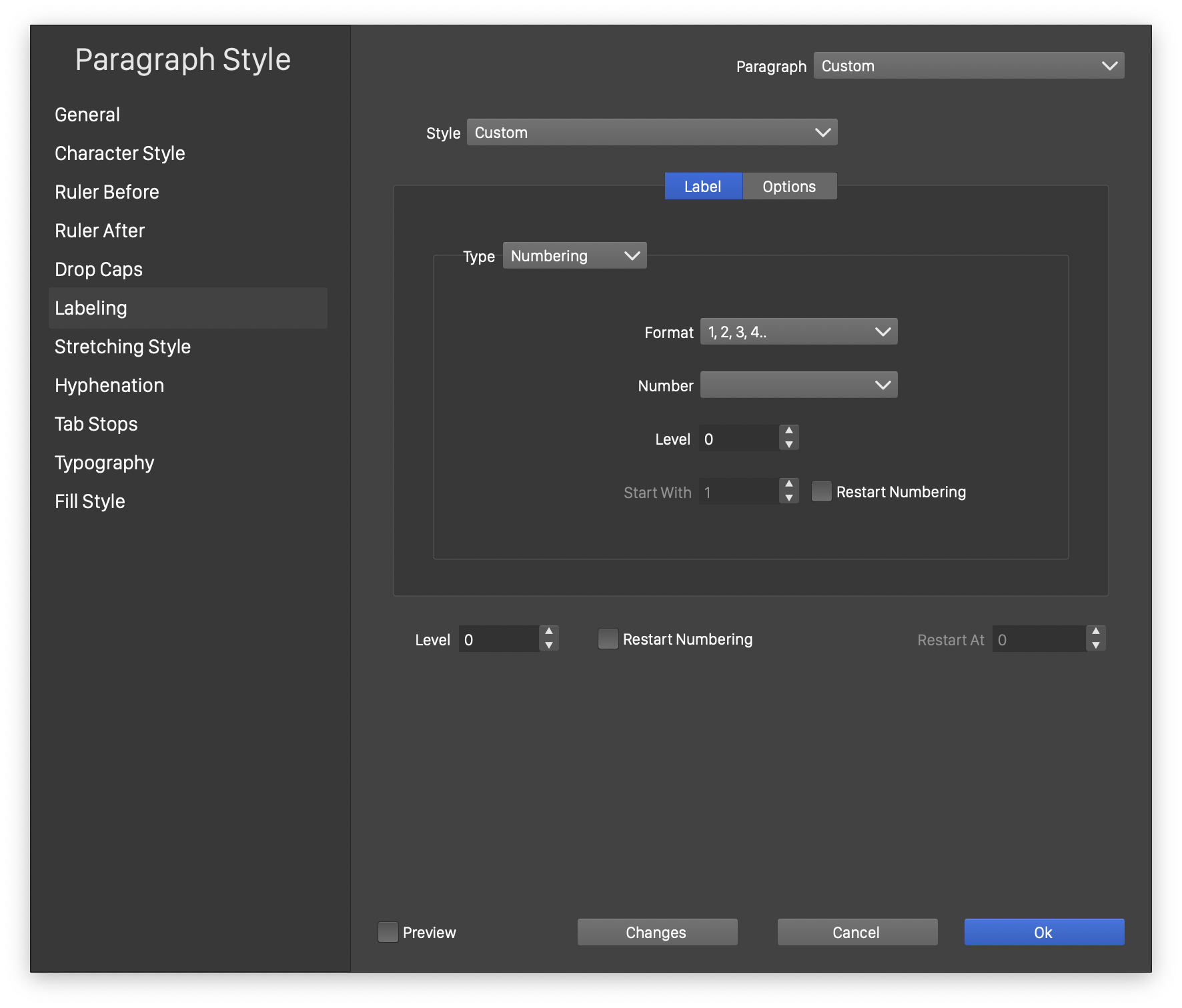 - Restart At - Edit the restarting count of the paragraph numbering.