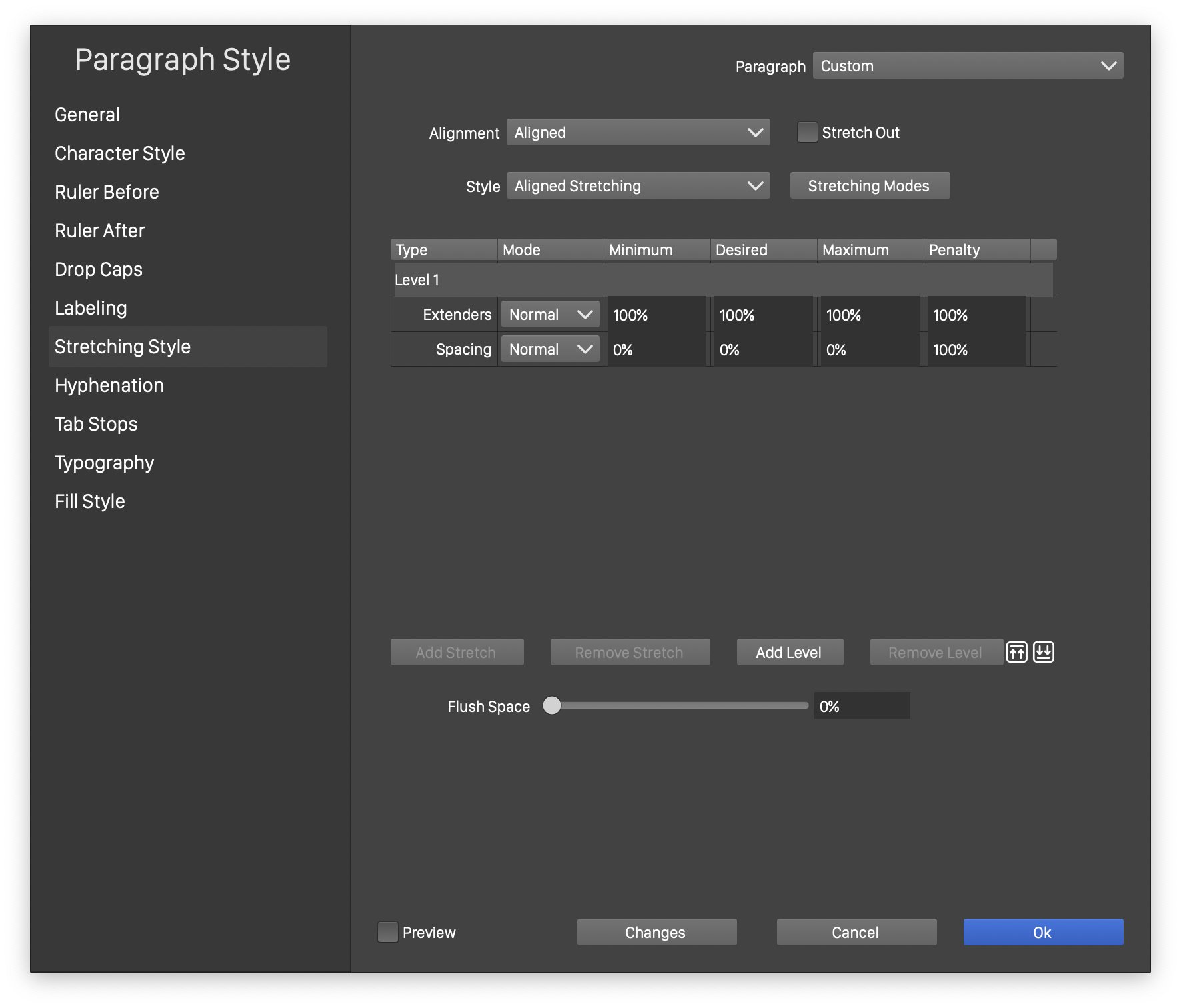 The Stretching section of the Paragraph Style view.