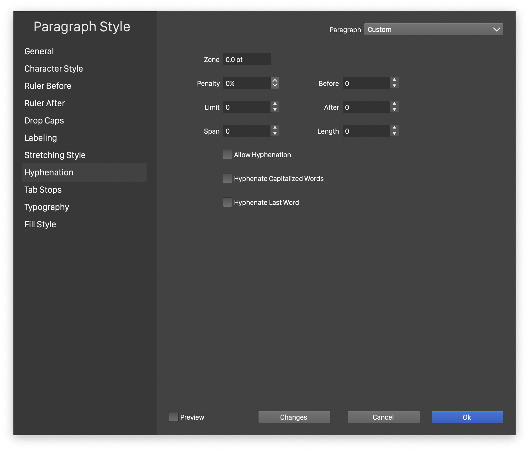 The Hyphenation section of the Paragraph Style view.