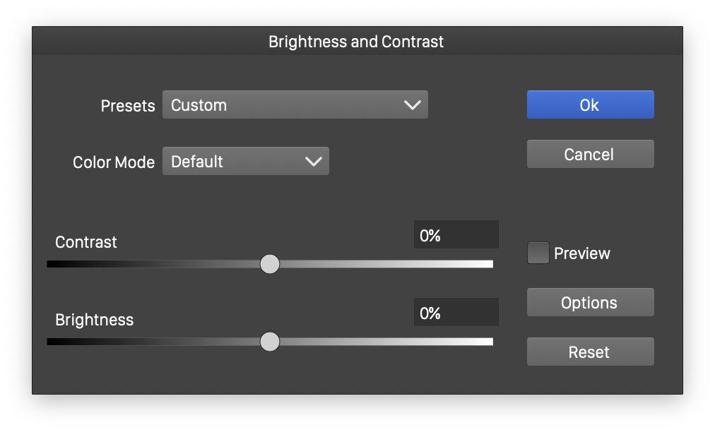 The Brightness and Contrast color filter (Effects - Adjust Colors - Brightness and Contrast), is used to adjust the brightness and the contrast of colors, using a selected color mode.