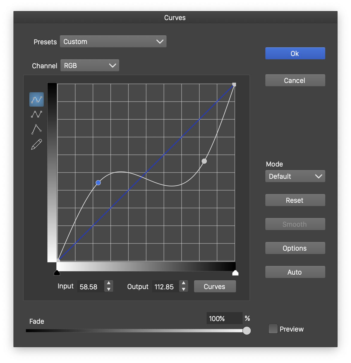 - The adjustment curve is edited interactively in the curve preview region, by dragging a location of the curve with the mouse.