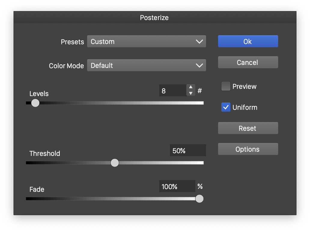 - Uniform - Enables or disables the uniform discretization of the color components. When enabled, each color component (of the selected color mode) will be reduced to the same number of fixed steps. When disabled, individual color components can be reduced to different number of steps, by setting these steps in the editors and sliders named after the color components (for example Red, Green or Blue for RGB color mode).