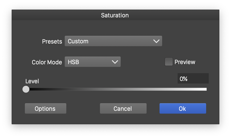 - Level - Adjust the saturation level. Levels between 0% - 100% will decrease the saturation, while levels above 100% will increase the saturation of the filtered colors.
