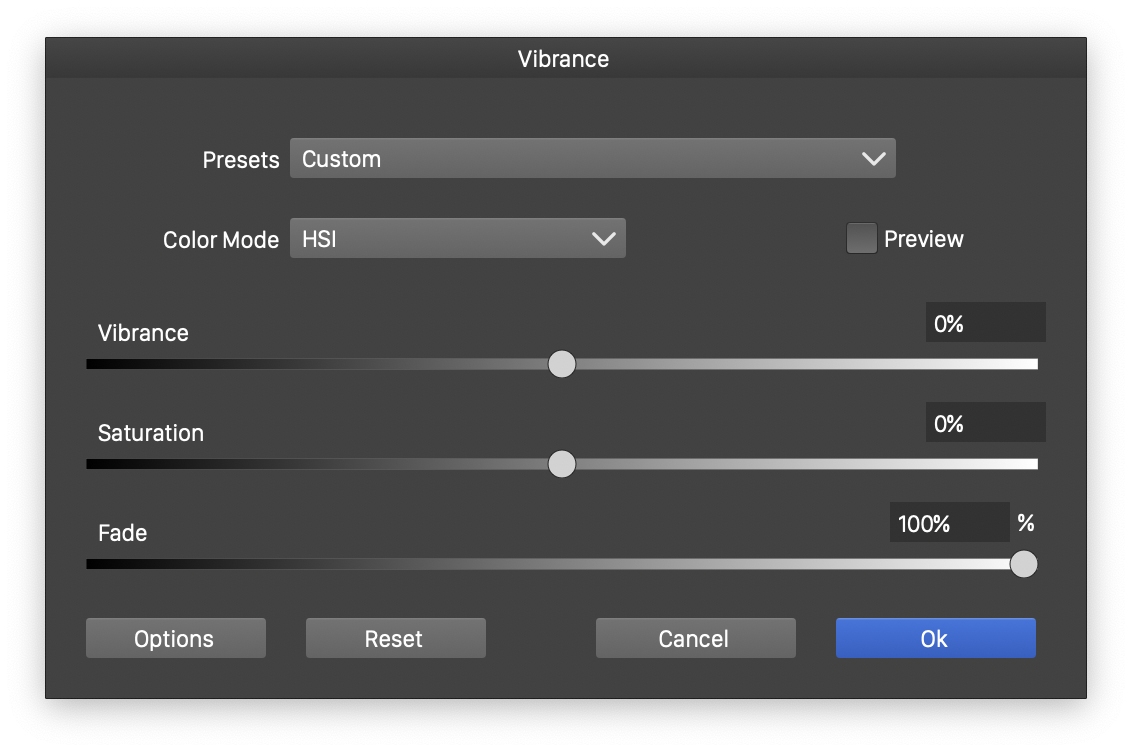 The Vibrance color filter (Effects - Color Tones - Vibrance), adjusts the vibrance of the colors in the selected artwork, or the whole artwork on the current canvas.