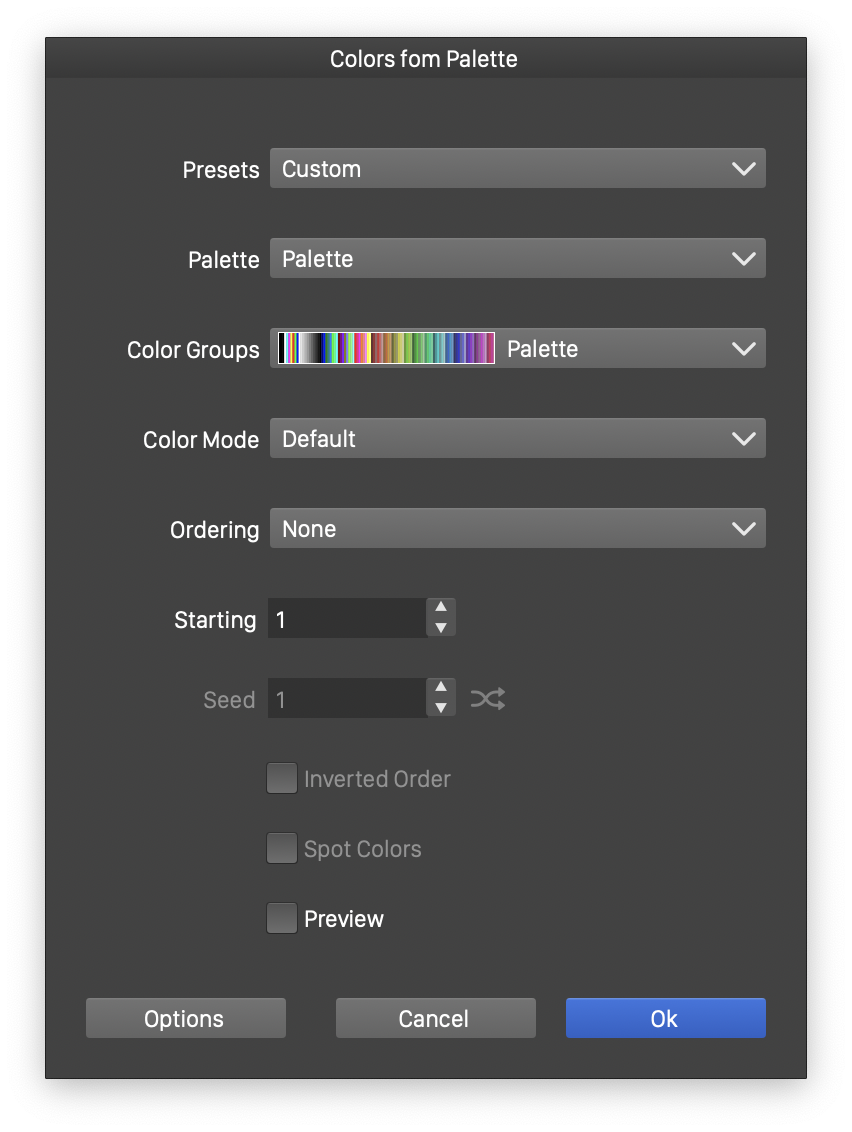 - Name - Edit the name of the resulting color group. The color group name is used when saving the color group to the current document palette with the