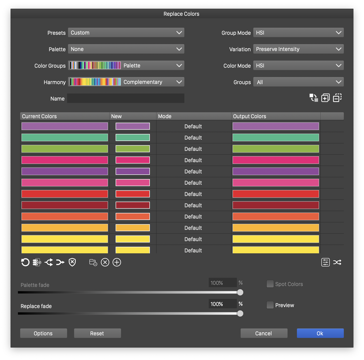 The replacement colors can be automatically generated using color groups or color harmonies. Colors can be grouped using a color grouping mode, selected in the Group Mode field.