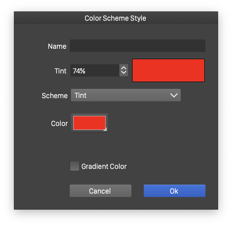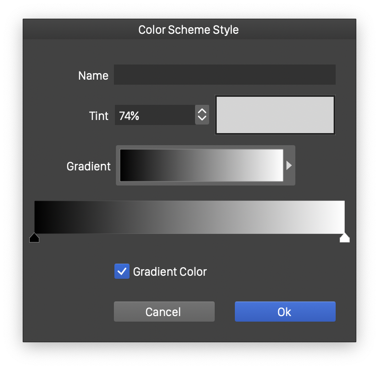 Color schemes are color styles generated from an other color (typically a color style as well), or a gradient. A color scheme generates a new color using an existing color style and a color adjustment scheme.