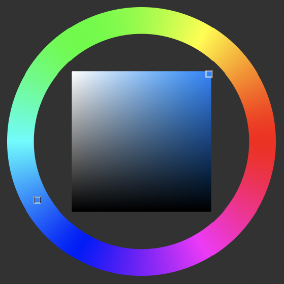 The Hue wheel with brightness and saturation square.