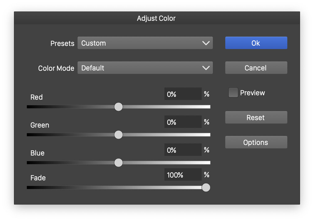 - Fade - Fade the final colors between the original colors and the adjusted color.