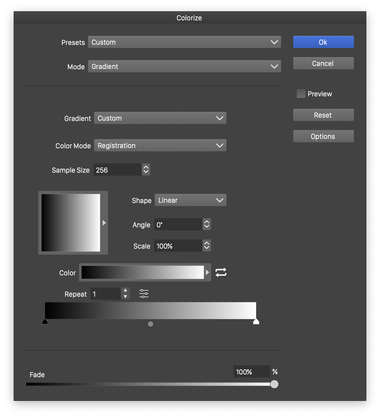 The following gradient colorization options are available (for more detains, see the Gradient chapter):