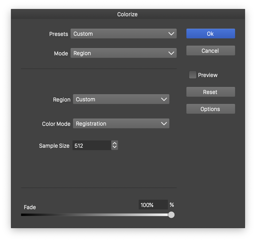 The colorization mode is selected from the Mode field. The following colorization modes are available:
