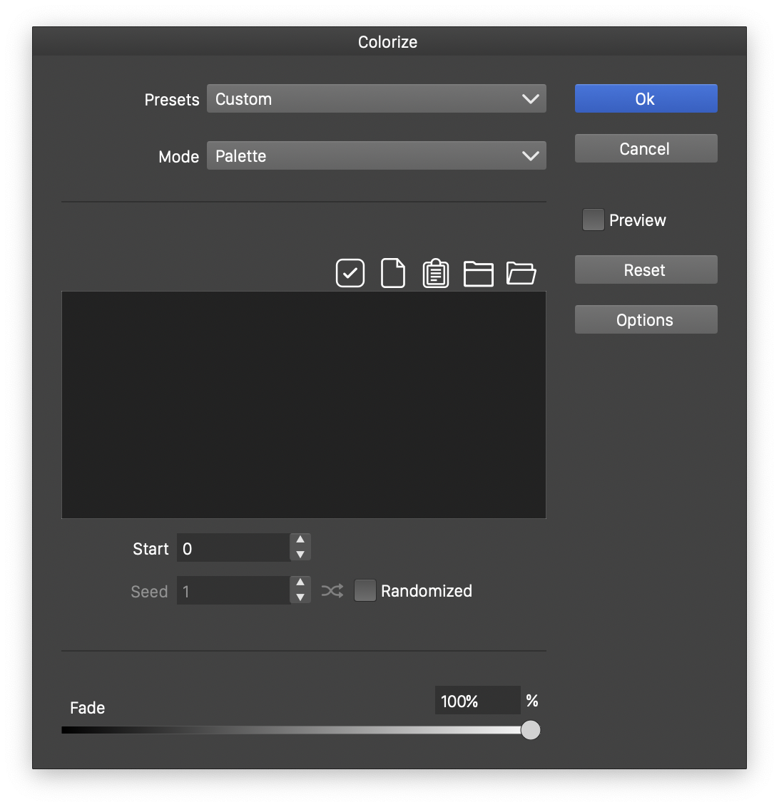 - Select a color palette file from a folder.- Start - Sets the starting position from the color palette. Colors are assigned starting from the color at this position in the palette.