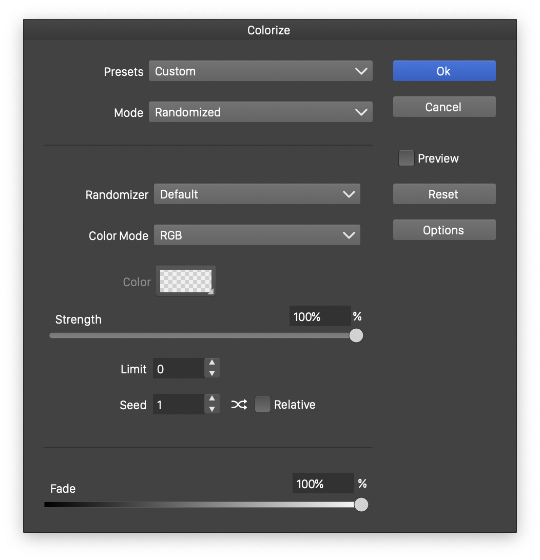 In the Randomized colorization mode, the new colors are generated randomly. The random color generation can be relative to a color, randomly adjusting the color components. Alternatively, the color components can be generated randomly as absolute amounts.