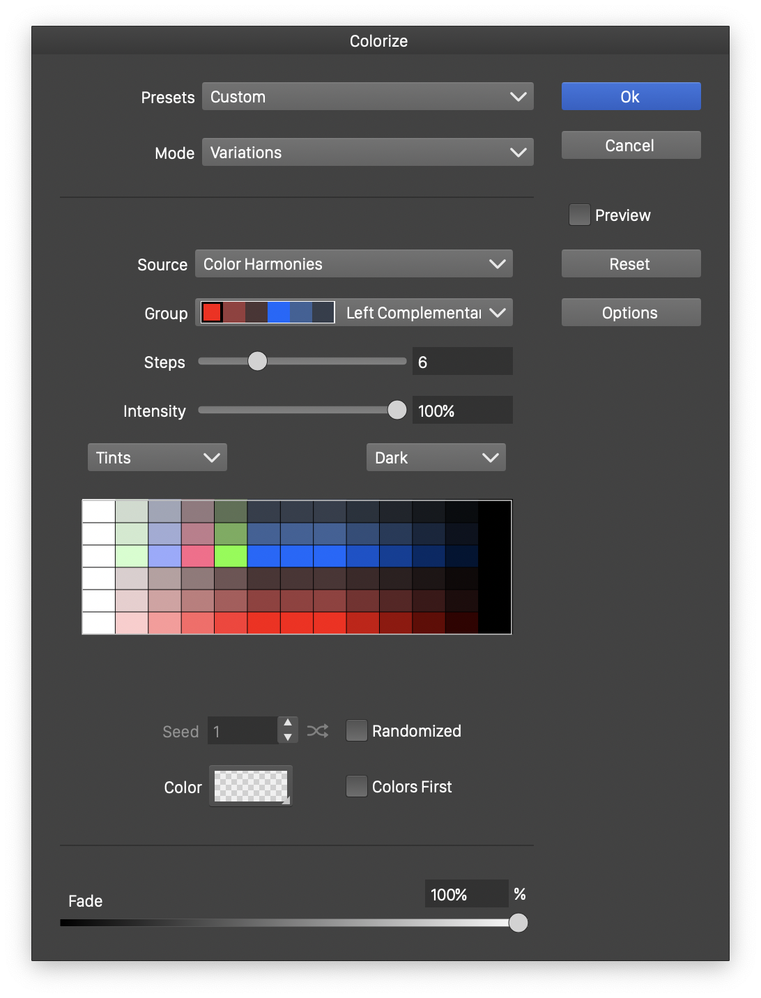 Colorizing with the variations mode, will generate color shades and tones around a color harmony set, selected from a single base color. The colors can be picked in the order defined by the color harmony, or in a randomized order.