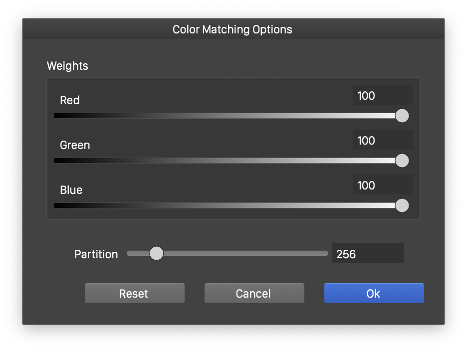 The Color Matching options are used when finding nearest colors in an other document or palette. These options can be accessed from various color filters, for example: Replace Colors, Nearest Color or, Nearest Palette Color.