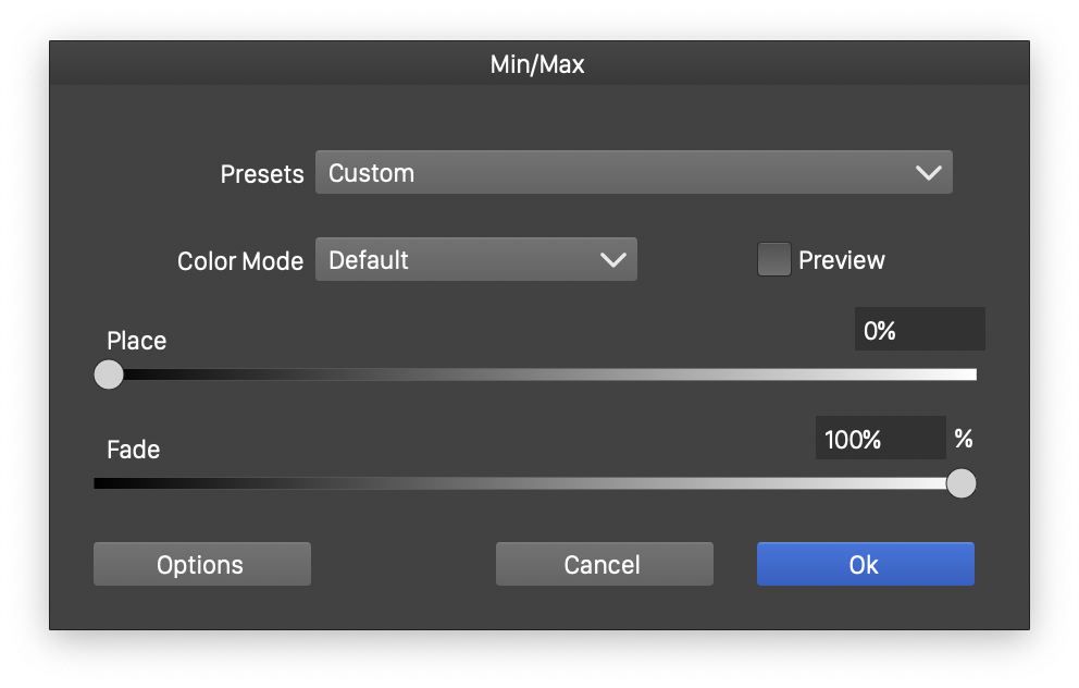 - Place - Choose a gray tone level between the minimum and maximum color channels. Selecting 0% will set the gray tones to the smallest color channel value. Selecting 100% will set the gray tones to the largest color channel value.