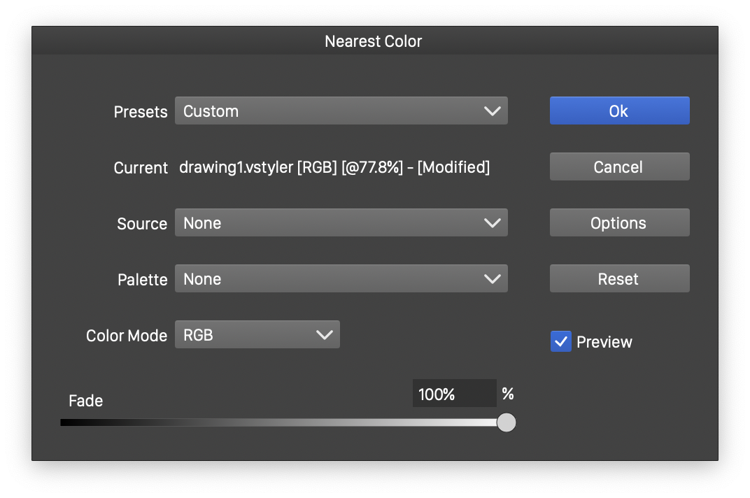 - Fade - Set the amount of fading between the original color and the nearest color found from the other document or palette.