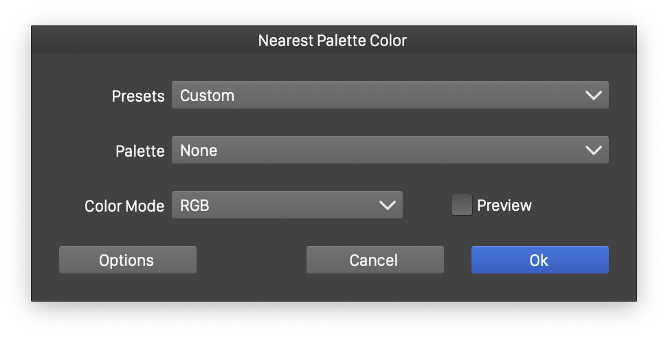 - Palette - Select a color palette, to find nearest colors from. When using a color palette, the colors are replaced with colors from the palette.