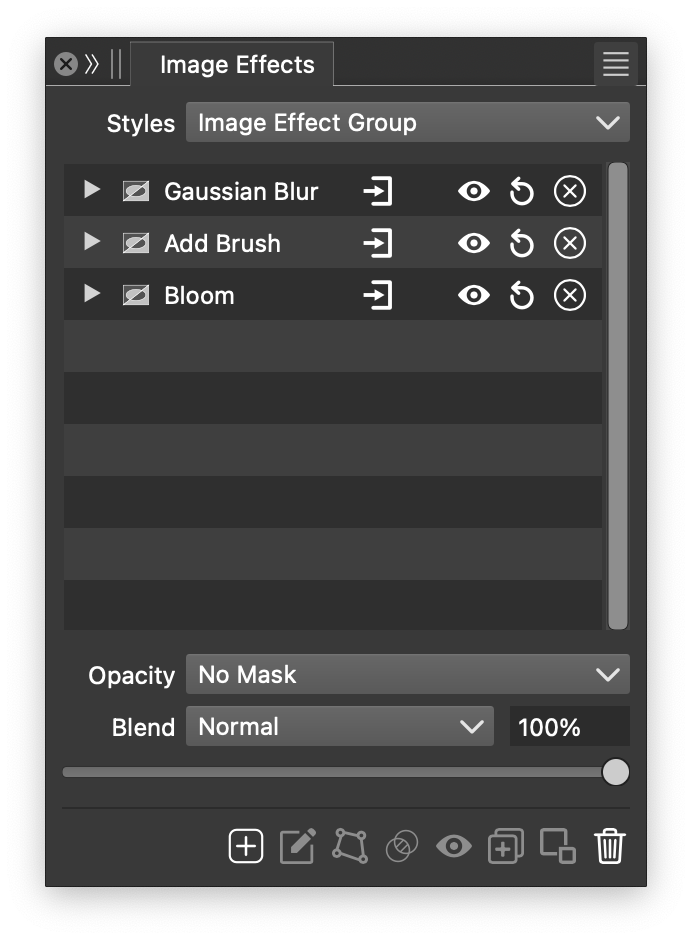 To select the common masking options of the group of image effects stacked on the selected object, use the masking and opacity fields at the bottom of the image effect list.