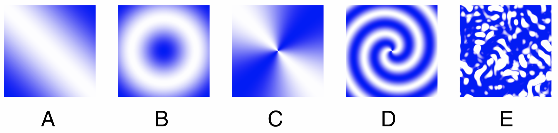 Various gradient shapes: (A) linear, (B) concentric, (C) conical, (D) spiral, (E) noise.