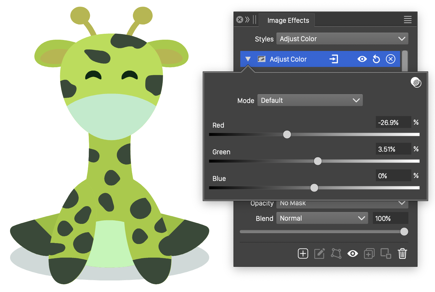 The Adjust Color image effect, adjusts the amounts of individual color channels in the selected color mode. The Adjust Color filter can be used to increase or decrease color component amounts.