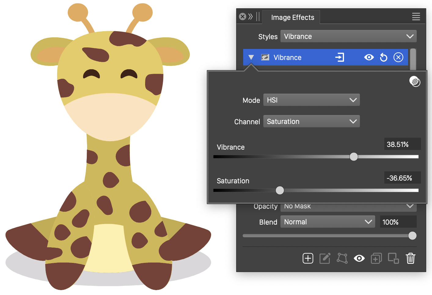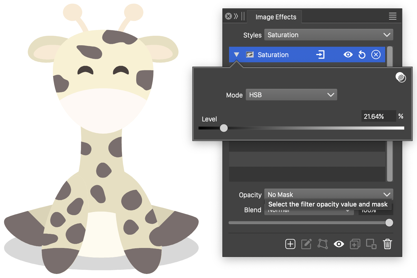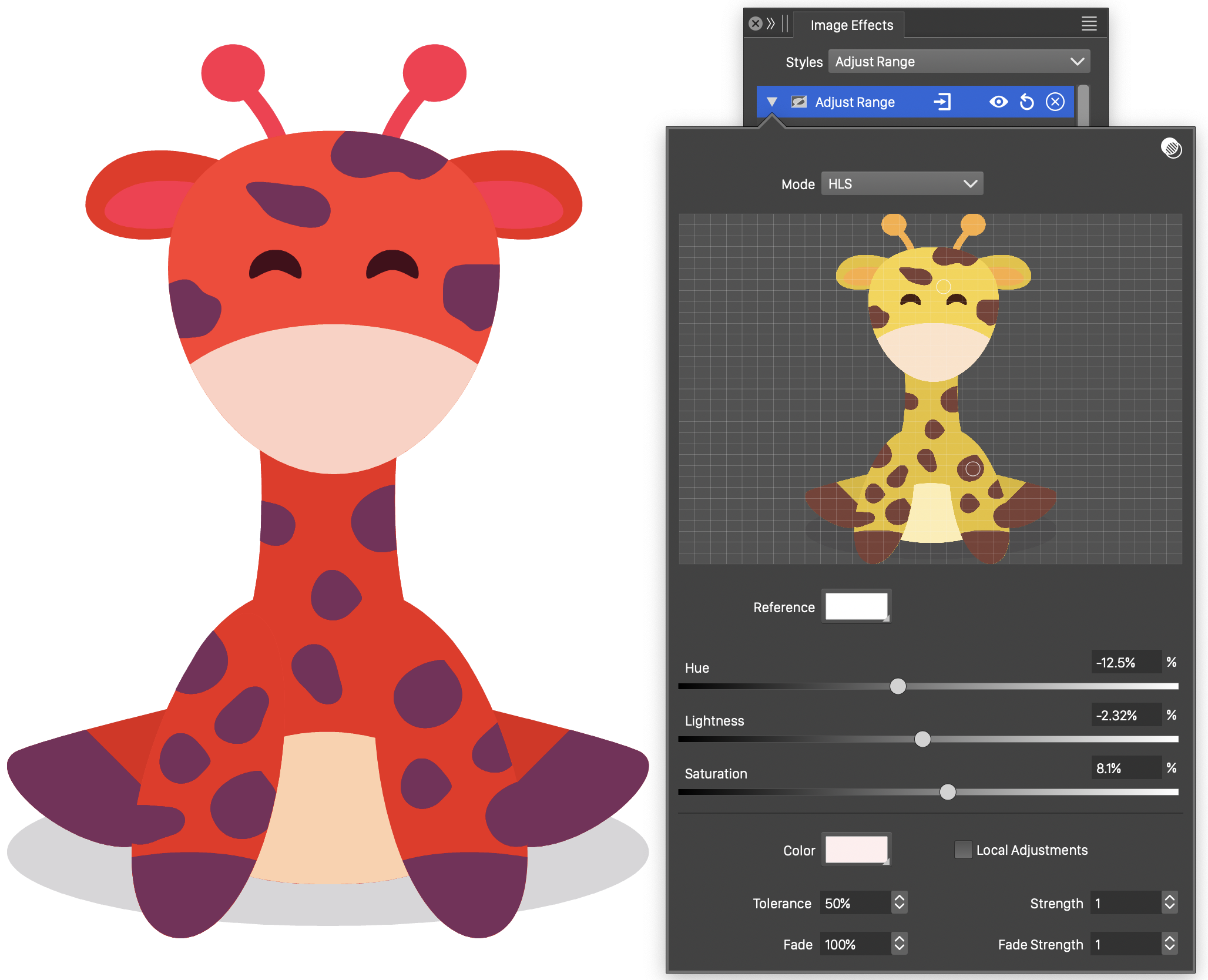 The color adjustment changes can be controlled using a common fading, provided by the image effect mask settings at the bottom of the Image Effects panel.