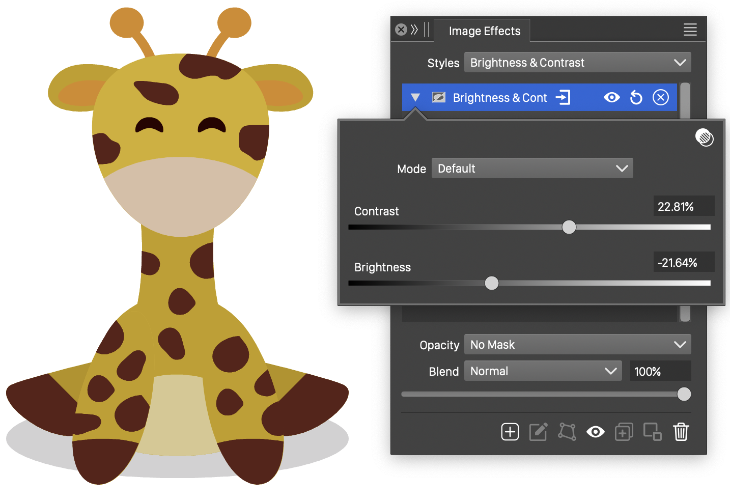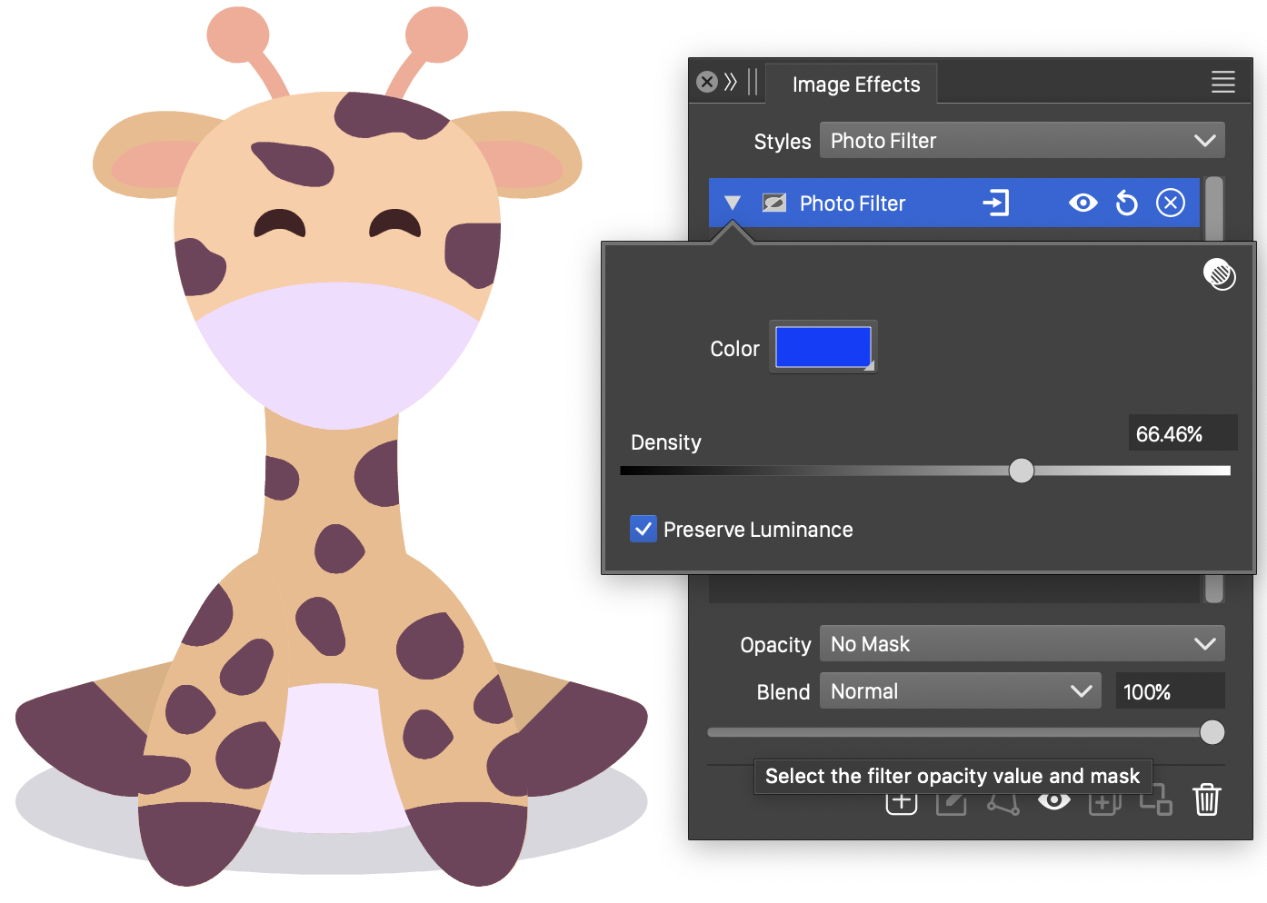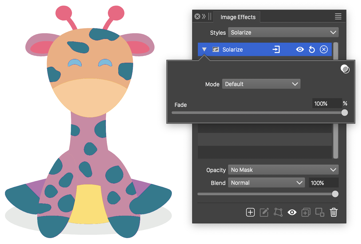 The color adjustment changes can be controlled using a common fading, provided by the image effect mask settings at the bottom of the Image Effects panel.