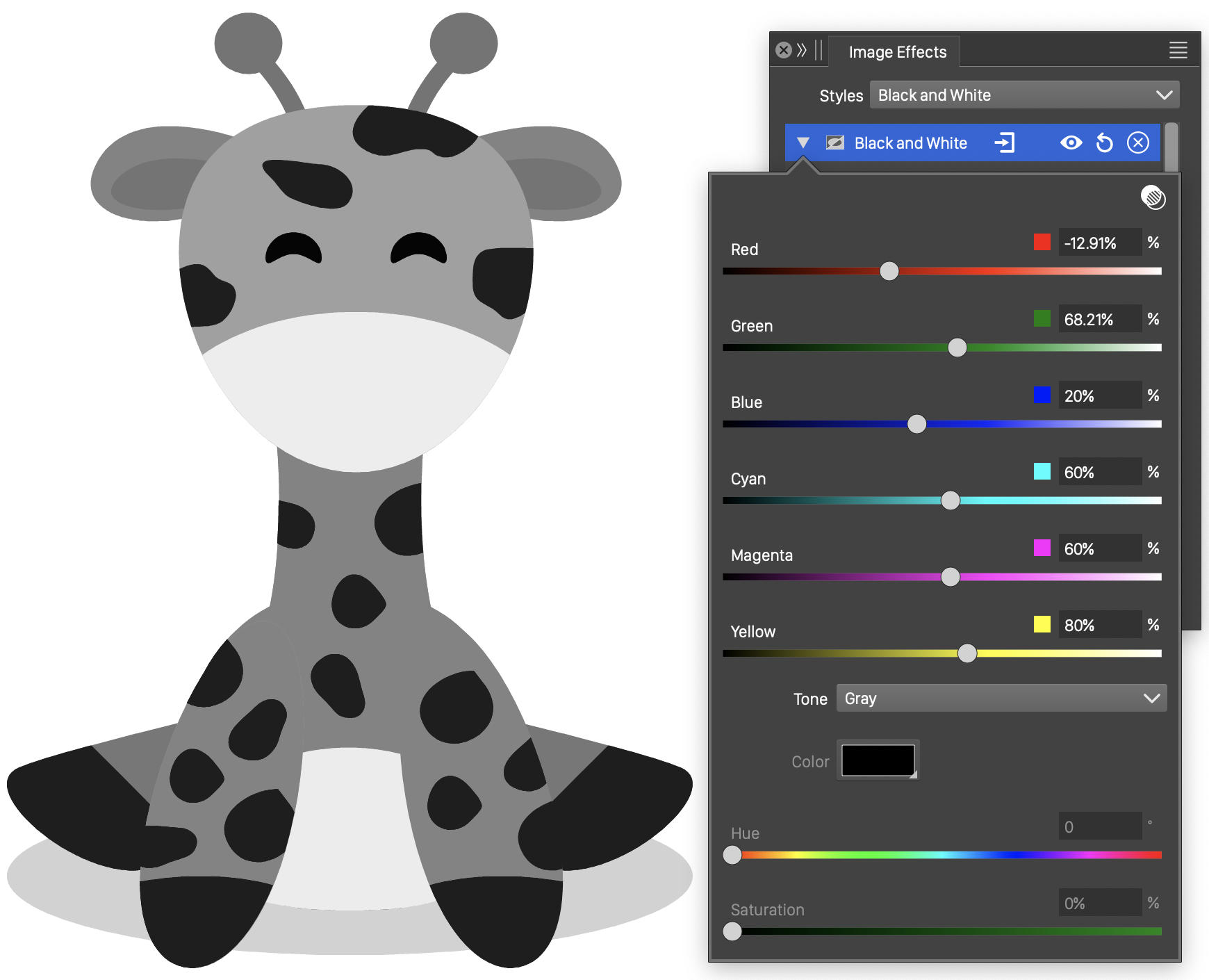 The Black and White image effect, converts the colors to a monochrome tone (black by default), using weights of various primary colors in the selected color mode. The Black and White filter can be used to create monochromatic renderings of color objects and images, using colors or gradients.