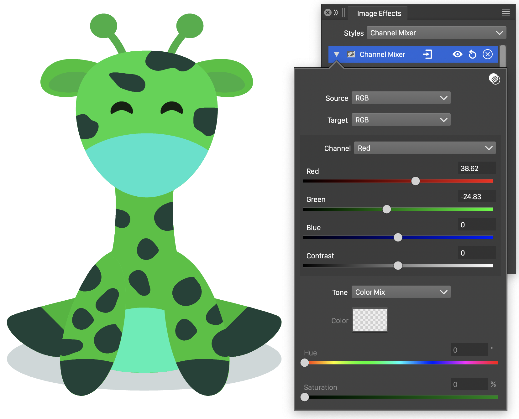 - Increase or decrease the color channel amounts using the sliders or the numeric editors.