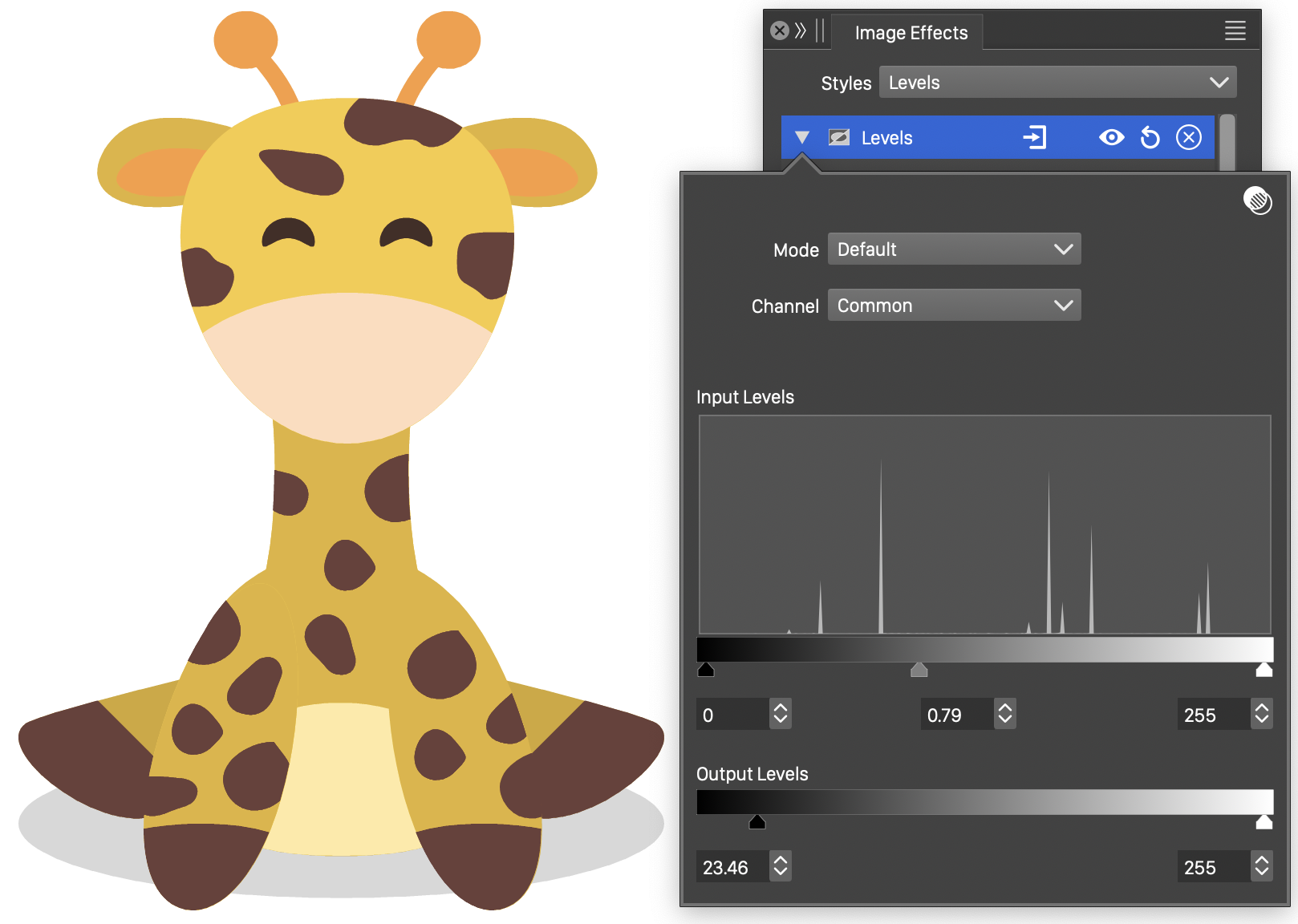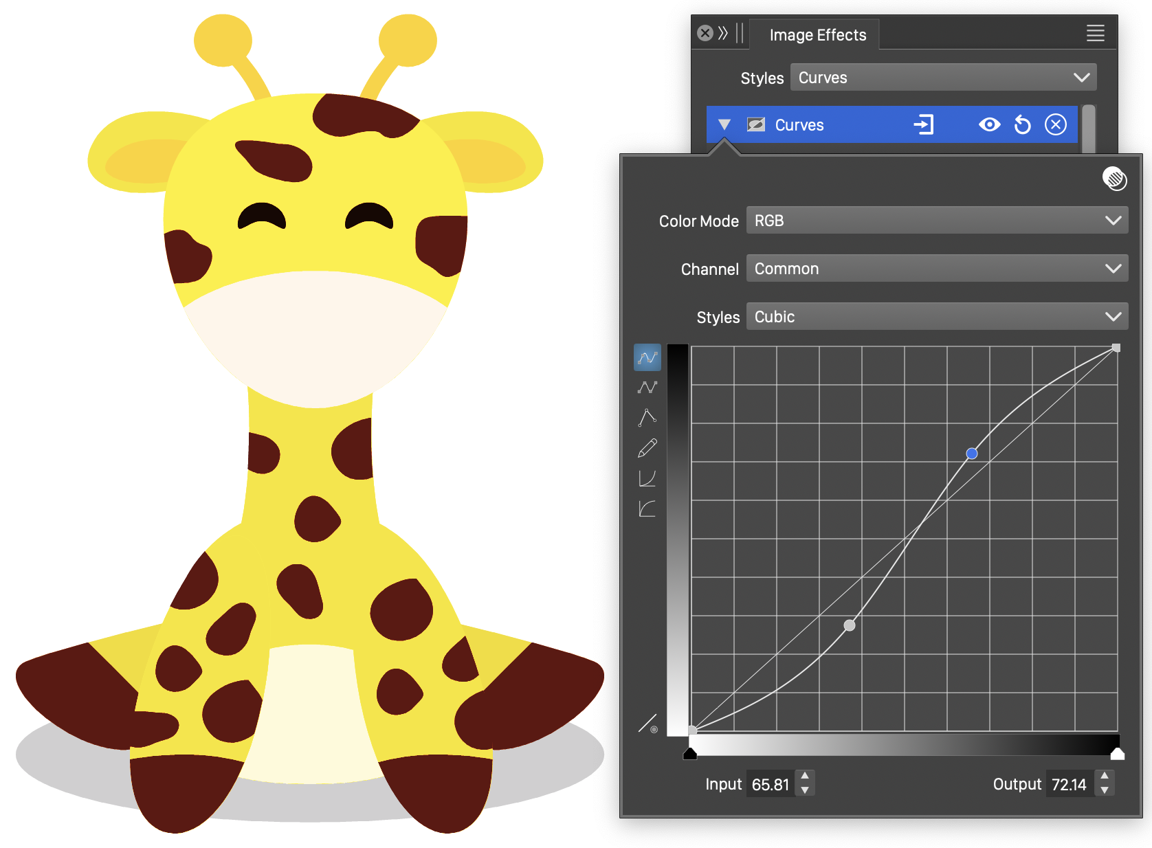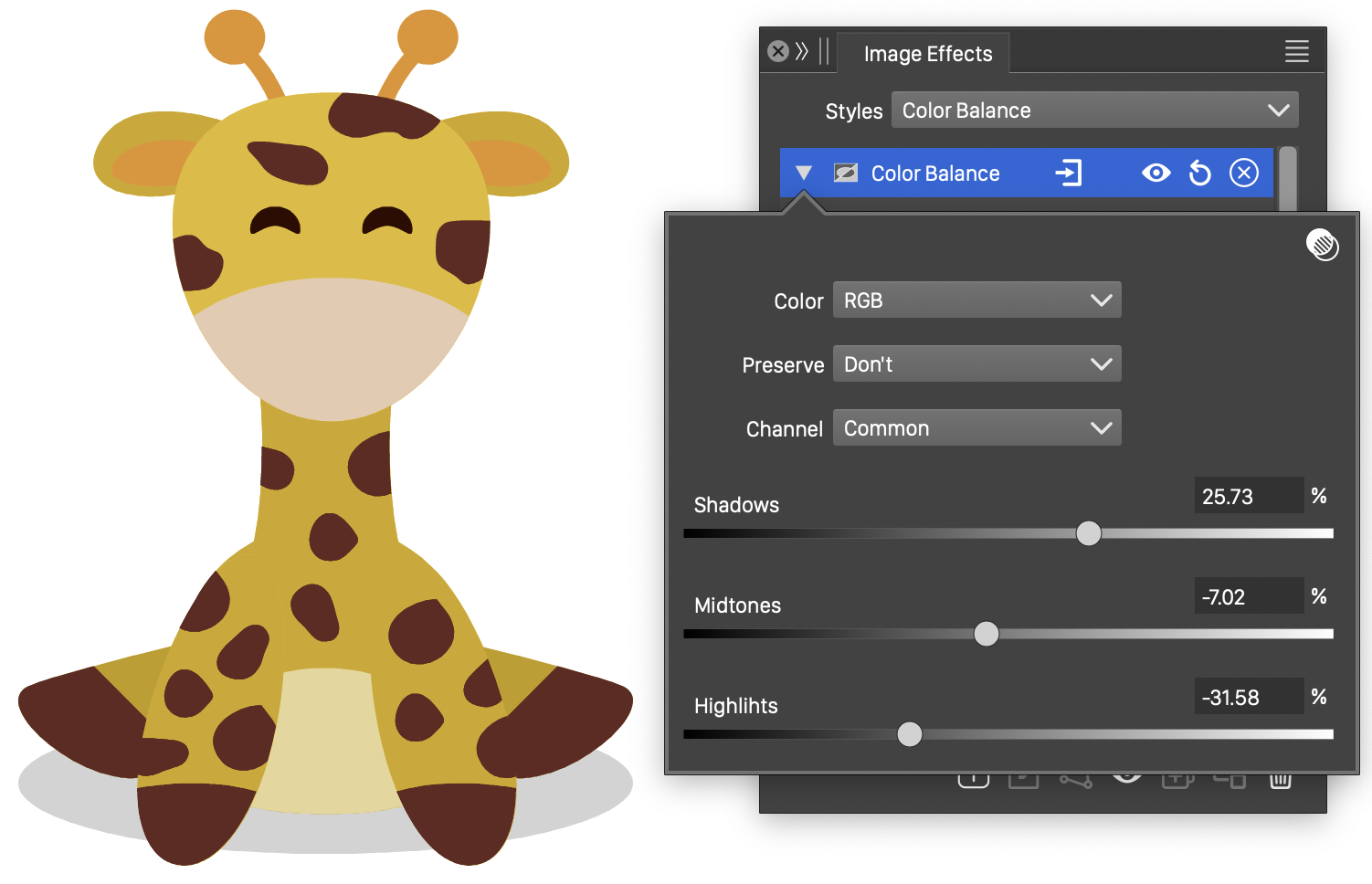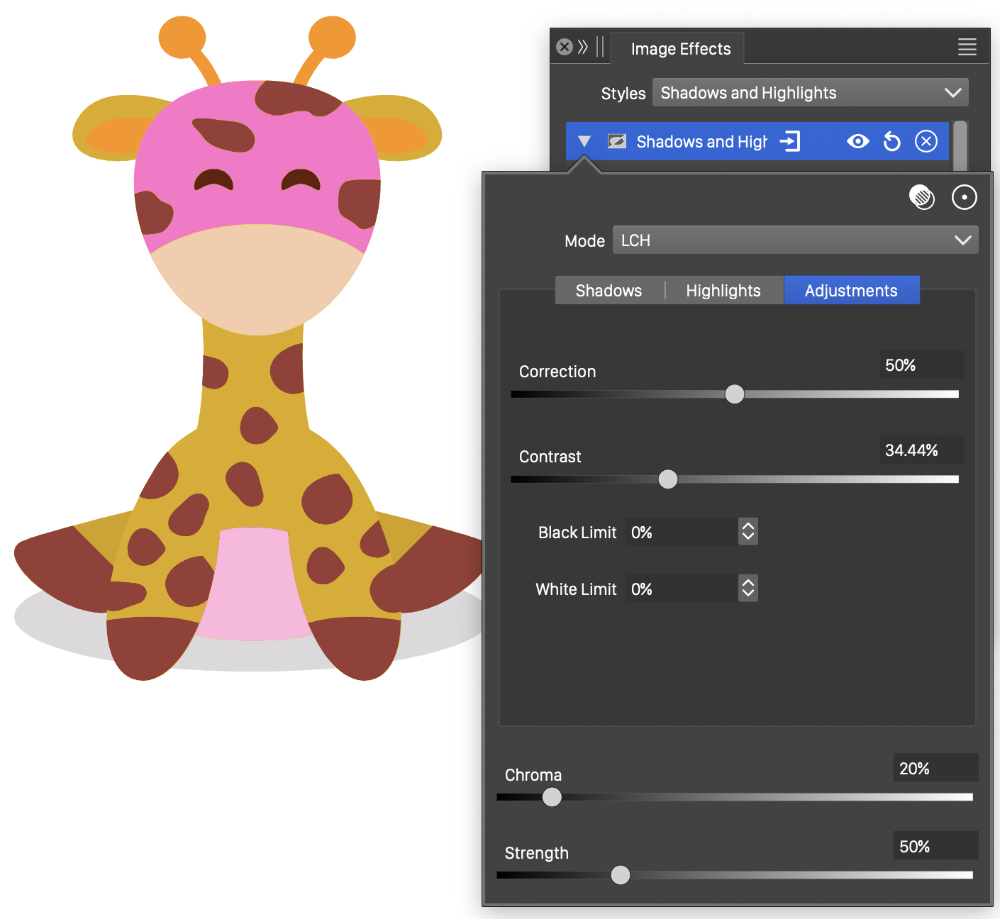 The Shadows and Highlights image effect, makes color corrections to shadow and highlighted regions. These adjustments are more suitable for photographic images imported into the document, than flat vector objects.