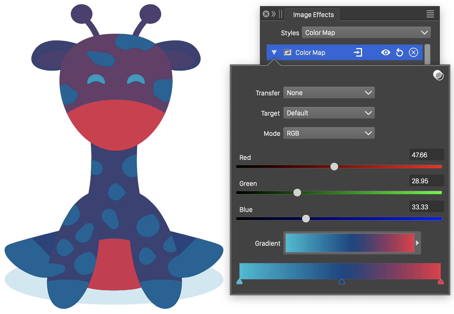 The Color Map image effect, converts the colors into tones from a gradient, by using the color component amounts in a selected color mode to calculate a single color tone value.