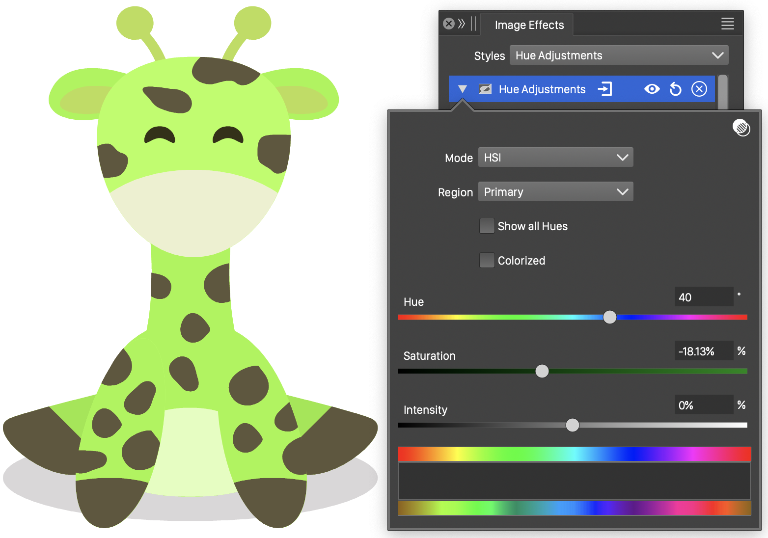 - The color component adjustments (Hue, Lightness, Saturation by default) can be set using the sliders and numeric fields corresponding to the color component names.