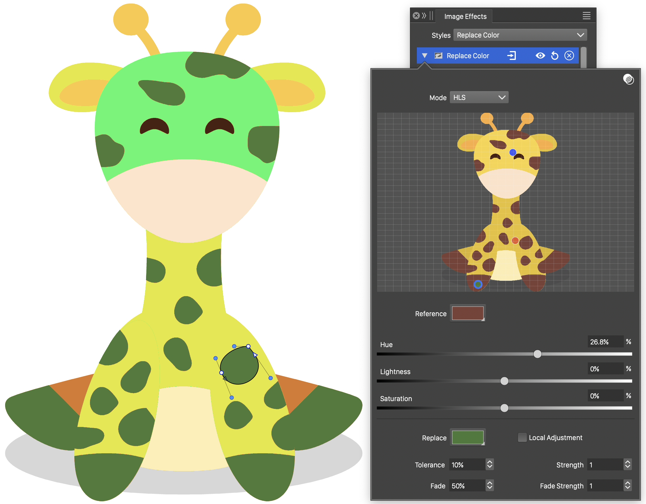 The Adjust Range image effect, adjusts colors using various levels of the same adjustment amount, based on the distance and matching to color adjustment nodes. The adjustment nodes are defined at image locations, with a color to search for.