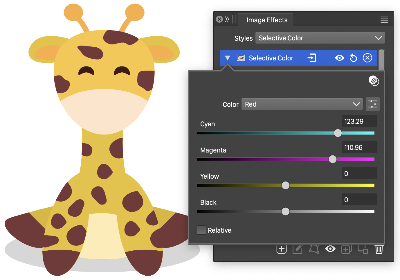 - Relative - Select relative or absolute adjustment mode. In relative mode, the adjustment values are used relative to the existing color component amounts. In absolute mode, the adjustment values are added to the existing color component amounts.