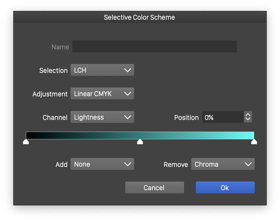 A selective color scheme is defined by picking a Selection color mode, and creating selection points along the components of the selection color mode.