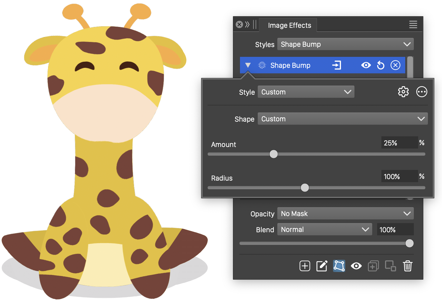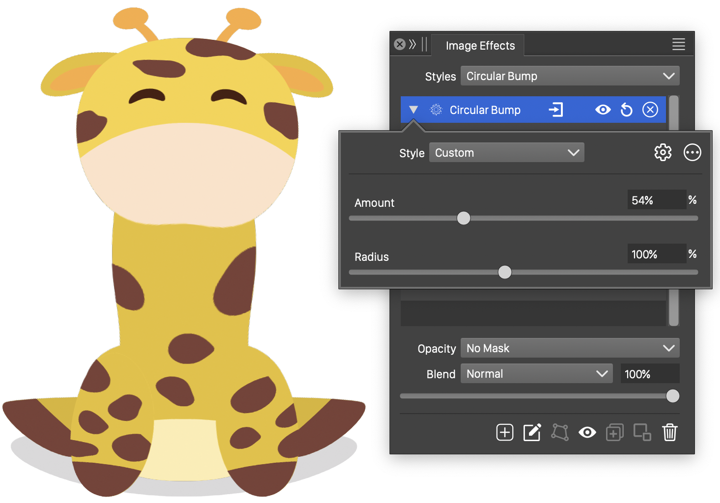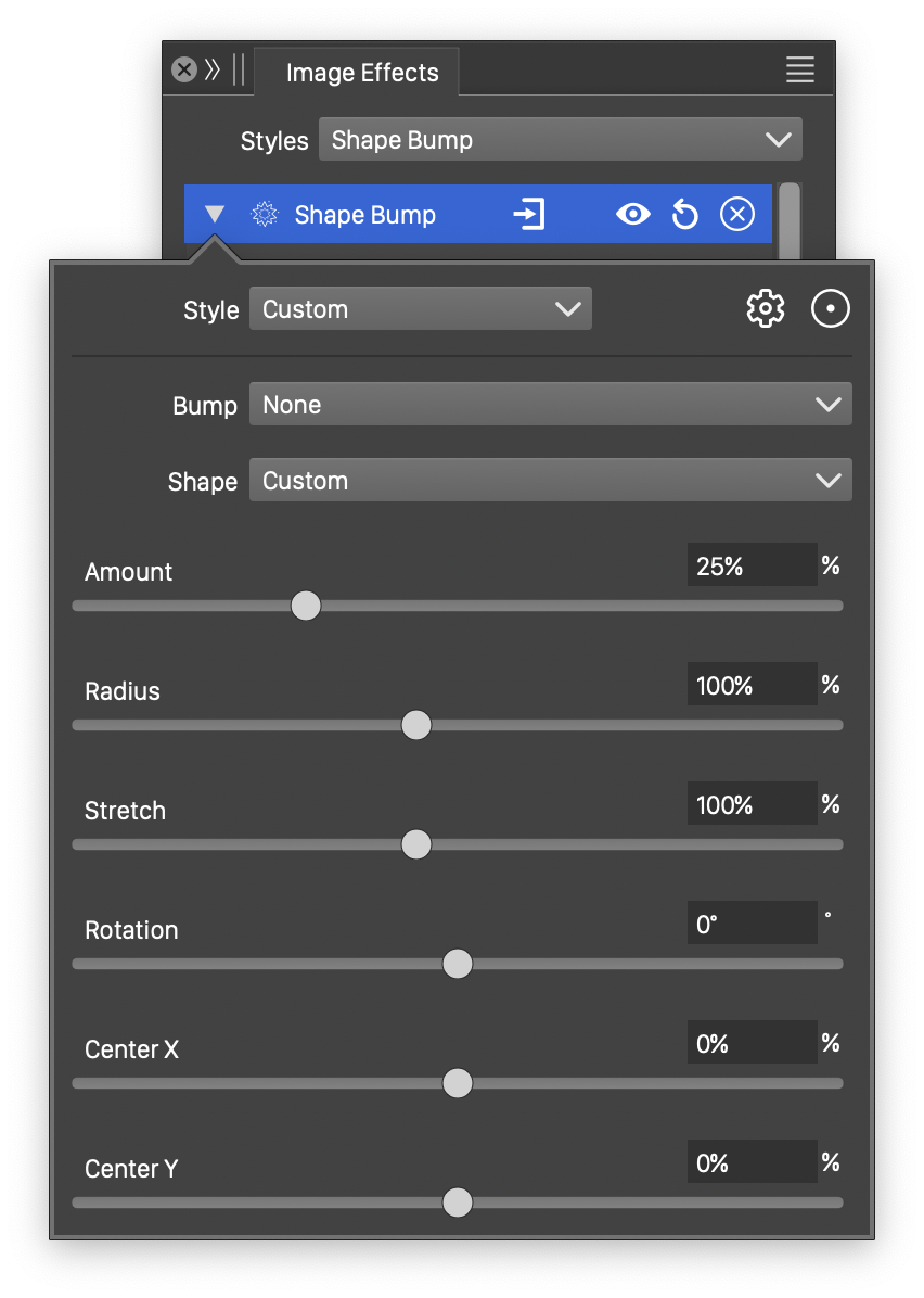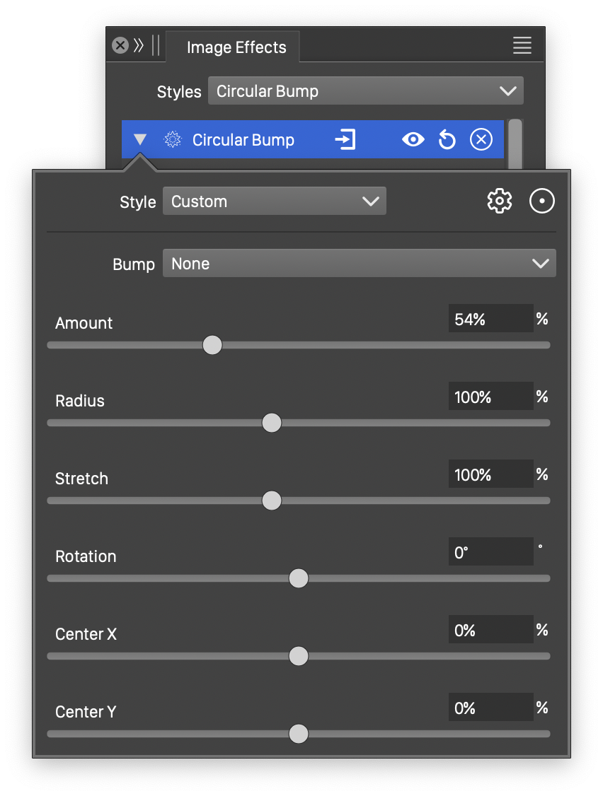 button in the icon section of the panel. - Amount - Set the amount of bump distortion from the center. The default distortion is set to 0%, resulting in no bump stretching. For values larger than 0%, the distortion stretches the shapes outwards from the center. For values smaller than 0%, the distortion stretches the shapes inwards to the center.